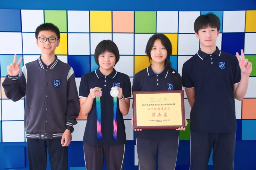 在近日举办的2025年龙湾区青少年游泳比赛中,温州上海世外学校选派的学生代表积极参与,完成了各项比赛。其中,初中部获得团体总分第五名的成绩。