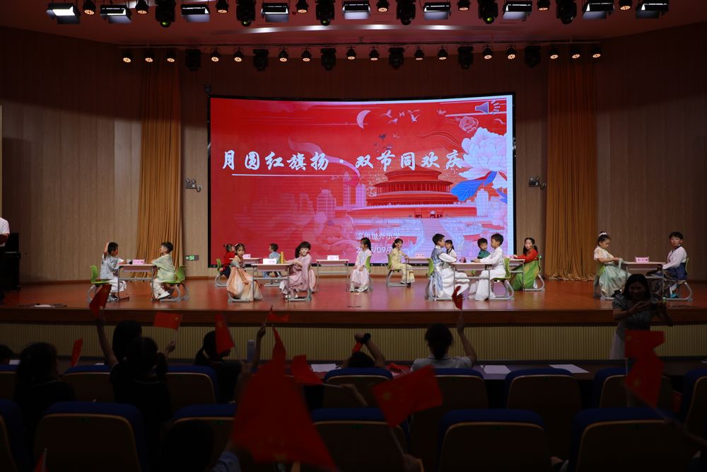 当中秋的圆月邂逅国庆的红旗,温州世外小学的校园里洋溢着团圆与崇敬交织的暖意。9月29日傍晚,二楼报告厅灯火璀璨,“月满华诞、家国同庆”主题庆典如期举行,全校师生齐聚一堂,在文化浸润与深情歌唱中,共赴一场双节之约。
